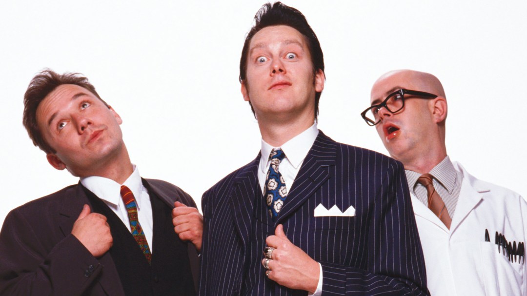 Every episode begins with Vic Reeves being introduced as Britain’s top light entertainer and singer. He sits at a desk piled with ever-increasing clutter and assorted nonsense (a bottle of alcohol marked “heroin”, a bowl of fruit, a dozen different kinds of microphone) and introduces various segments and guests. The character of Vic Reeves always seems like a bad guy – he’s self-aggrandising, quick to fly into fits of rage, and impossibly cruel to his mute assistant in a lab coat, Les (Fred Aylward) – and gradually reveals himself to be full-on monstrous. Everything that could be straightforward instead has an absurd inflection: Vic’s cruel treatment of Les typically centres on baiting him with spirit levels (which Les adores) and threatening him with chives (which he fears).