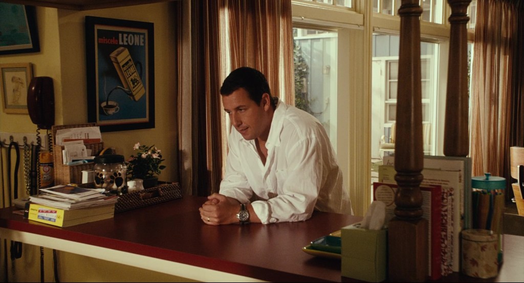 When I describe the archetypal Happy Madison protagonist as a pathetic man, I don’t mean they’re personally embarrassing or have a low social status (though they’re usually one or the other). I mean that they have pathos. Happy Madison films are comedic studies of men in pain, who lack something in themselves or their lives, who feel stuck in place and cannot go on like this forever. Sandler in particular is great at playing these kinds of characters, men who are frustrated with their lives, but resigned to them nonetheless, men who feel emasculated and overlooked, and who inevitably snap and do something stupid at least once per film. He has subtly expressive eyes that betray pain easily, a hangdog demeanour he’s grown into with age, a scratchy voice that cracks softly when he’s sad. A lot of analysis of the decline of Happy Madison, including mine, has focused on the changing class character of Sandler’s protagonists. They’re mostly working-class schlubs in his early films, then get increasingly wealthy until the early 2010s – when his default was plastic surgeons and ad execs, and the films hit their creative nadir – then get poorer again after Happy Madison signs their exclusive distribution deal with Netflix in 2014. It didn’t turn them around right away or anything, and they’ve never reached the heights of their early years, but it has certainly played a role in their moderate creative renewal on streaming.