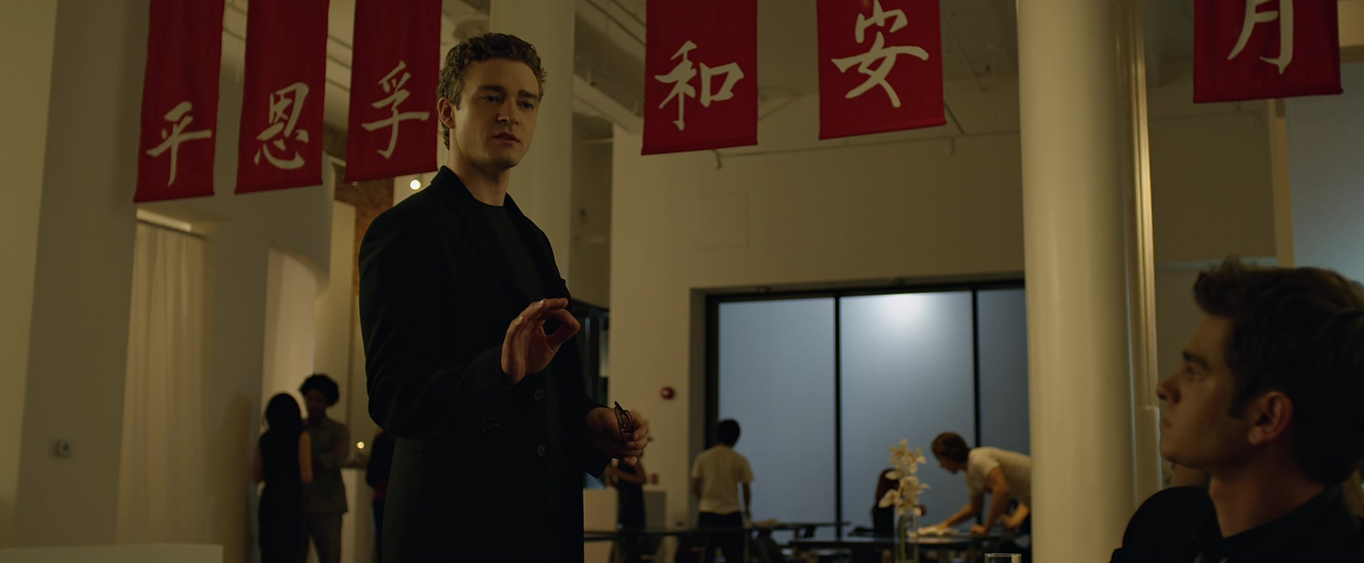 Later, full of cocaine and inflated self-worth, Sean is so full of blustering bravado and paranoia that with a lesser performance he’d just seem like a cheap, slimy conman. But Timberlake plays Sean so magnetically charismatic that it takes most of the film to figure out how much of his talk is bullshit. You can understand equally why Mark loves him on sight and Eduardo hates him just as instantly.
