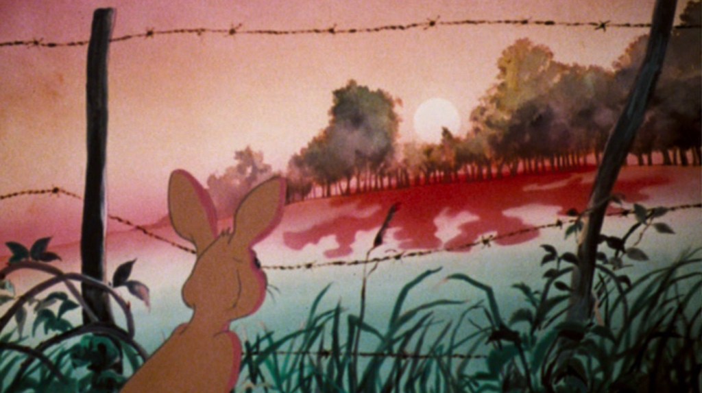 John Hubley was supposed to direct Watership Down but left shortly into production. This means that the opening he directed is fittingly in a totally different animation style to the rest of the film: it’s the creation myth of the rabbits, the story they tell themselves to make sense of their world, forging their society the way humans’ creation myths have for millennia. “If they catch you, they will kill you,” their god tells them, giving the rabbits the gifts of speed and cunning, “But first they have to catch you.” It sets the film apart instantly from so many talking animal pictures. Watership Down is a movie whose world is complete, as full as our own, even as it never gives more information that the audience can process.
