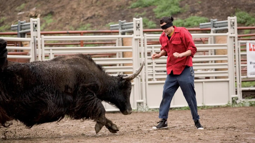 One of the most reasonable misapprehensions most people have about film is that it’s a narrative medium. I don’t begrudge them that misunderstanding, but it makes me very happy that Jackass has helped so many people enjoy the pure cinematic delight of bodies in motion across frames for their own sake. Just in bike-based stunts alone, we have Knoxville and Dunn trying to do BMX tricks on penny farthings, Danger Ehren trying to ride a minibike around a tiny loop, and Knoxville and Pontius trying to jump a lake with rocket bikes. It’s deliriously fun from start to finish.