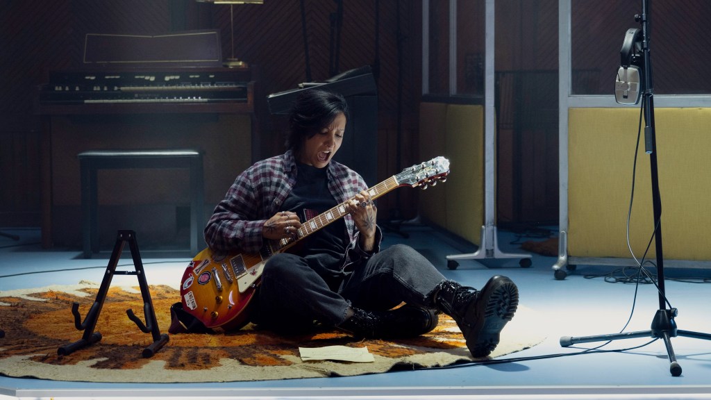 Ciara: “Most of ‘Funny Muslim Song’ is shot in We Are Lady Parts’ house style: there’s some fun split screen when the band sign their record contract, but it’s mostly function over form. As all the characters trundle along their story paths, Saira meets her hero, pioneering Muslim woman rocker Sister Squire (Meera Syal). Squire describes Lady Parts’ music as ‘funny Muslim songs,’ asking if Lady Parts will make use of the trail she blazed and use their platform to speak out about atrocities happening to Muslims around the world. Saira has an existential crisis about it. She insists they need to add serious political tracks to their album, and gets pushback from the band and the label for reasons legitimate (is it really their place, or should they be elevating other voices?) and not (there’s no ‘atrocity bangers’ playlist they can go on). The whole plot has an obvious metatextual relevance: should Nida Manzoor be making her funny Muslim show or does she have a duty to do something more?